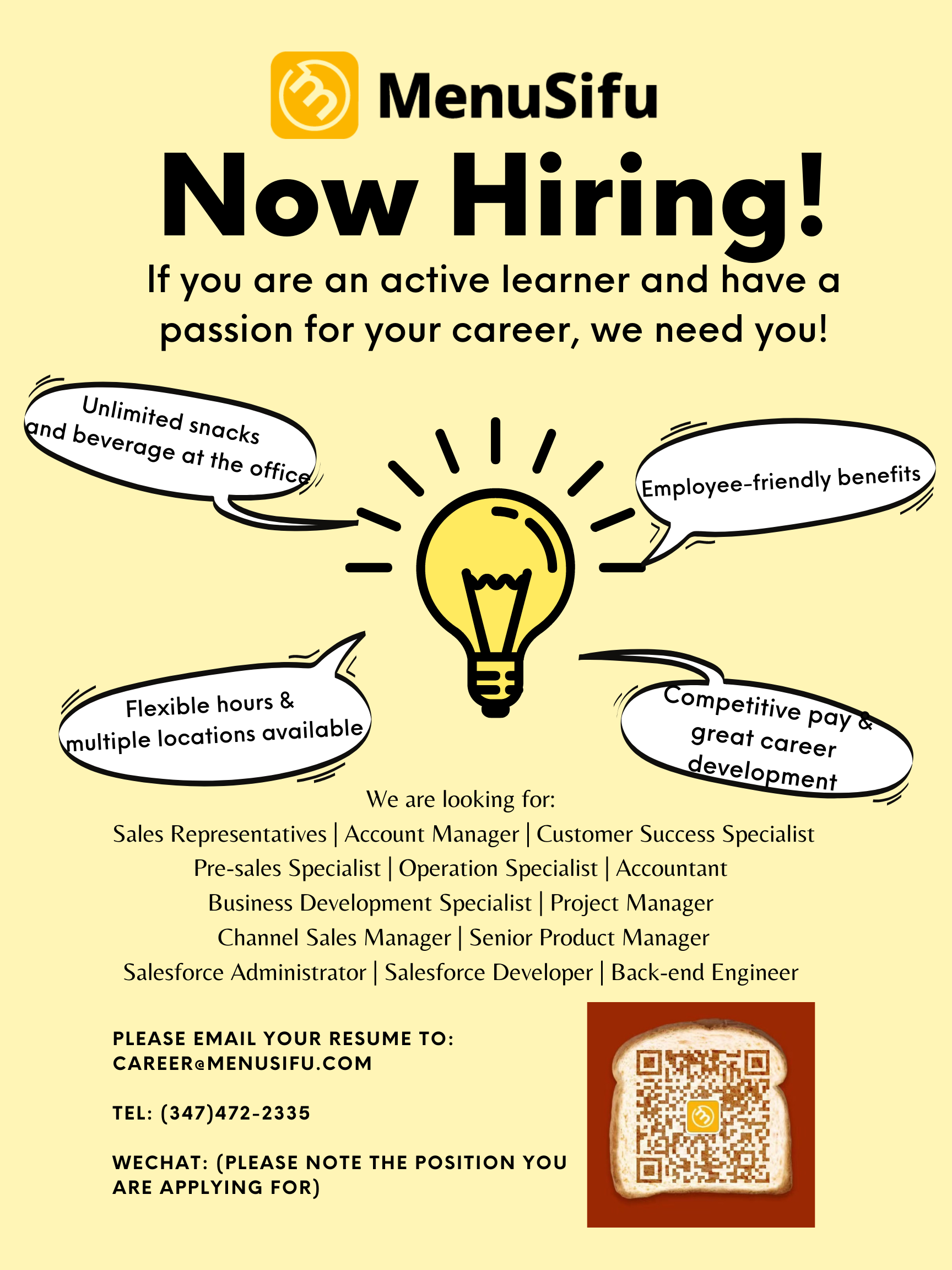 MenuSifu诚聘多位全职人才 MenuSifu Inc.总部位于纽约曼岛,是以智能点餐系统为核心产品,开