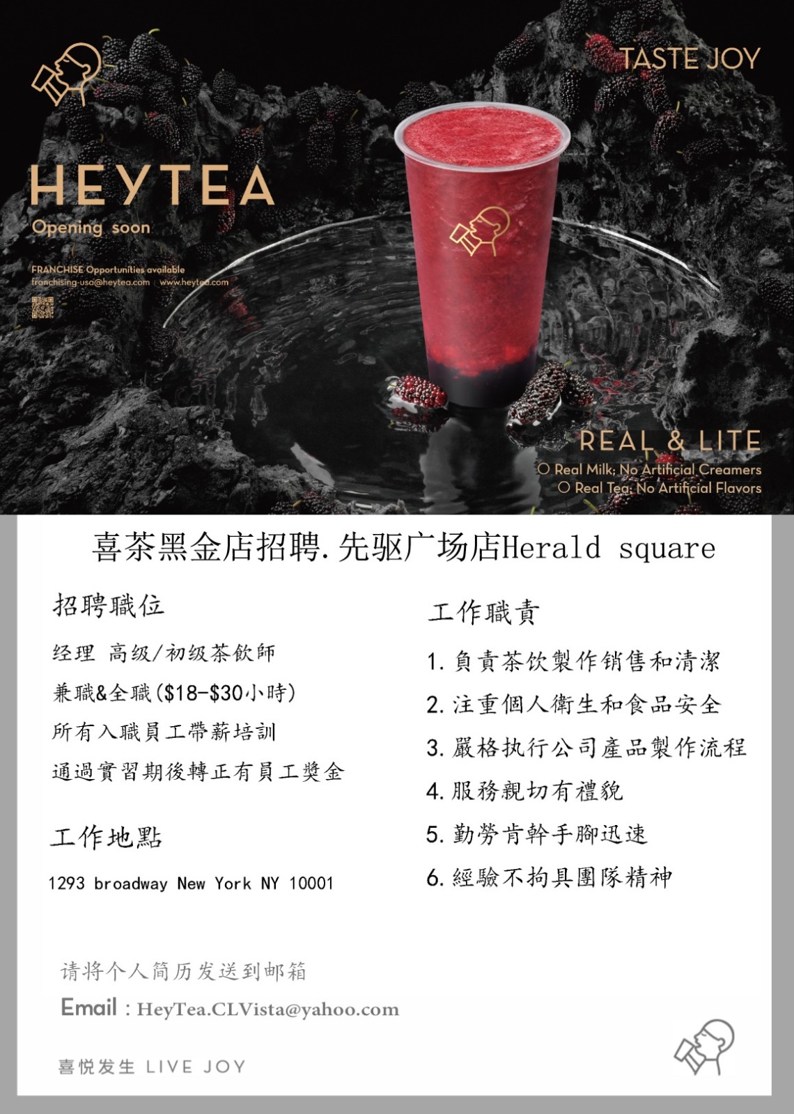 纽约招聘职位喜茶招聘喜茶黑金.先驱广场店Herald square?Join Our H